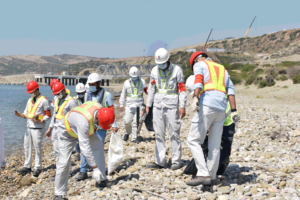 “映山红·保护海龟”青年志愿者清理沙滩上的塑料袋、塑料罐等垃圾,为海龟繁衍留出生命通道。