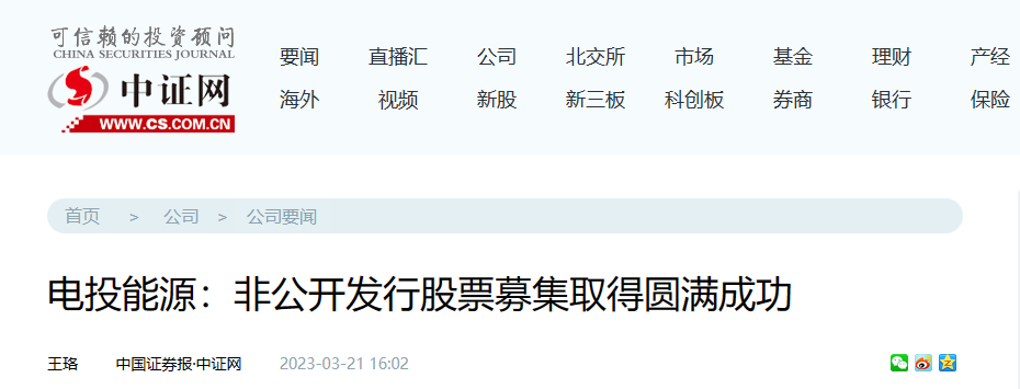 3月21日,中国证券报及中证网同步刊发《电投能源:非公开发行股票募集取得圆满成功》一文,介绍了电投能源非公开发行股票从集团公司系统外引进国内国际知名投资机构权益资本24亿元,较好的优化了股本结构,每年节约财务费用近亿元,大幅提升了投资能力。此次成功发行股票,是运用资本市场助力转型发展的良好实践,是实现资本运作创造新价值的成功体现。以下为报道全文: