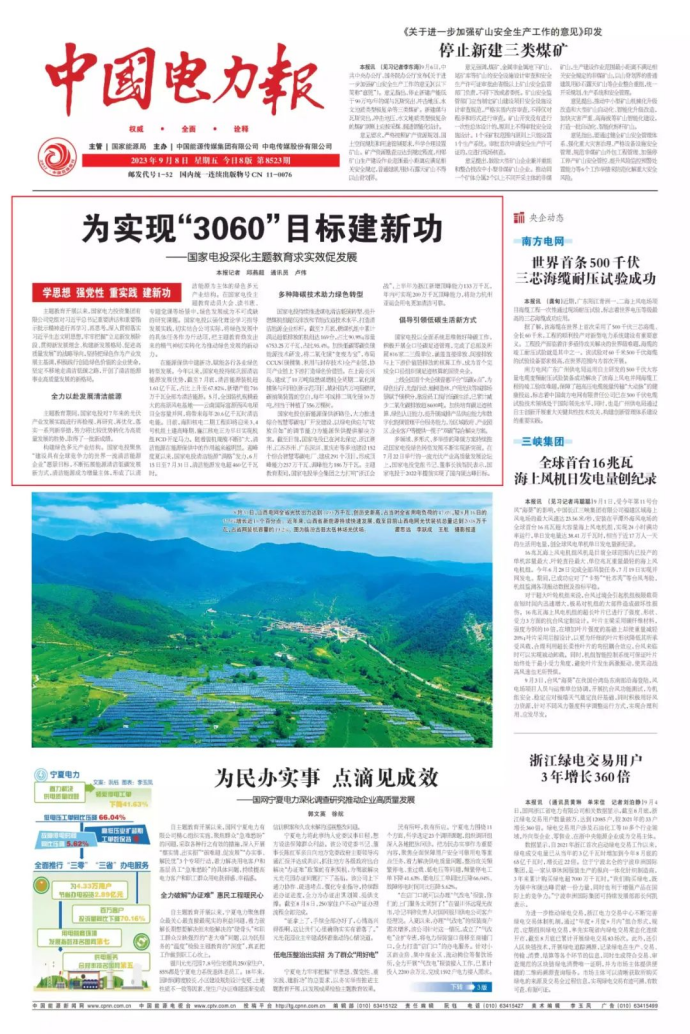 9月8日,《中国电力报》头版头条刊发《为实现“3060”目标建新功——米兰体育(中国区)体育官方网站深化主题教育求实效促发展》一文。报道称,主题教育开展以来,集团公司党组对习近平总书记重要讲话和重要指示批示精神进行再学习、再思考,深入贯彻落实习近平生态文明思想,立足新发展阶段、贯彻新发展理念、构建新发展格局,推动高质量发展,坚持把绿色作为产业发展主基调,积极践行创造绿色价值的企业使命,坚定不移地走清洁低碳之路,开创了清洁能源事业高质量发展的新格局。以下为报道全文: