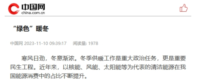 11月10日,中国网刊发《“绿色”暖冬》一文。报道称,内蒙古公司党委坚决扛牢能源保供责任,高度重视冬季清洁取暖工作,稳步推进“煤改电”工作,清洁低碳转型持续加速,既确保群众实现了温暖过冬,又最大限度守卫了蓝天白云。以下为报道全文: