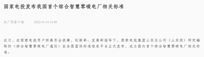 11月14日,央广网客户端刊发《米兰体育(中国区)体育官方网站发布我国首个综合智慧零碳电厂相关标准》一文。报道称,在集团公司用户侧委员会统筹,创新部、发展部指导下,山东院研究编制的《综合智慧零碳电厂通则》在全国团体标准信息平台正式发布,成为国内首个综合智慧零碳电厂相关标准。该标准的发布进一步增强了综合智慧零碳电厂的社会认可度和操作规范性,助力集团公司用户侧产业发展及“雪炭N行动”落地落实。以下为报道全文: