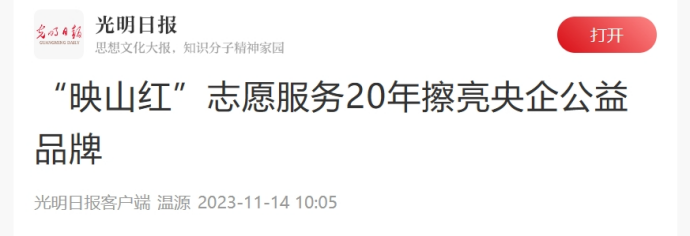11月14日,光明日报客户端刊发《“映山红”志愿服务20年擦亮央企公益品牌》一文。报道称,集团公司在京举办“映山红”志愿服务20周年纪念大会,“映山红”志愿服务一直成长、一直向上,逐步实现项目化、品牌化、体系化,承载着集团公司广大青年志愿者的精神价值,已经成为企业志愿服务乃至中国青年志愿服务中具有标杆性、引领性的项目。以下为报道全文: