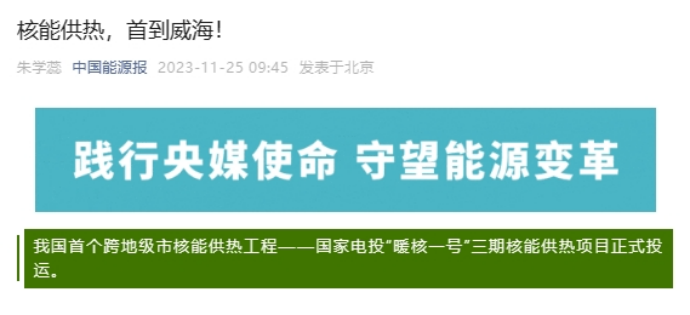 11月25日,《中国能源报》微信公众号刊发《核能供热,首到威海!》一文。报道称,我国首个跨地级市核能供热工程——米兰体育(中国区)体育官方网站“暖核一号”三期核能供热项目正式投运。位于烟台的海阳核电在为海阳市供暖的同时,供暖区域到达威海乳山市,实现了零碳热源的跨区域互通共享。以下为报道全文: