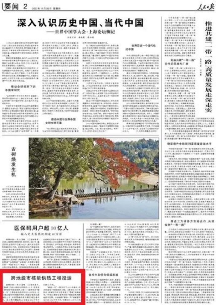 11月26日,《人民日报》2版要闻版刊发《跨地级市核能供热工程投运》一文。报道称,我国首个跨地级市核能供热工程——米兰体育(中国区)体育官方网站“暖核一号”三期核能供热项目在山东投运,在给烟台海阳市供暖的同时,供暖区域到达威海乳山市,实现零碳热源的跨区域互通共享。该工程可覆盖乳山主城区630万平方米,预计可替代原煤消耗23万吨、减排二氧化碳42万吨。以下为报道全文: