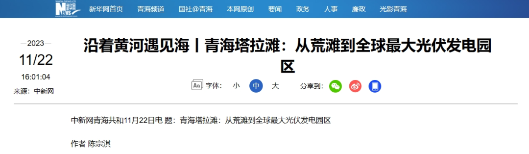 近日,新华网刊发《沿着黄河遇见海丨青海塔拉滩:从荒滩到全球最大光伏发电园区》一文。报道称,在塔拉滩光伏发电园区内,光伏板根据地势的起伏排布,超过700万块光伏板在草甸上铺开,总装机容量达2.2GW,建成全球装机容量最大的光伏发电园。以下为报道全文: