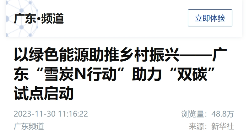 近日,人民日报客户端、新华社客户端刊发《以绿色能源助推乡村振兴——广东“雪炭N行动”助力“双碳”试点启动》一文。报道称,广东公司结合广东省“百千万工程”相关要求,聚焦能源产业与乡村振兴、“双碳”目标深度融合,科学编制了《开平市“雪炭N行动”极致方案》,规划覆盖翠山湖高新区、苍城镇、大沙镇、赤坎镇等13个行政区域,规划建设清洁能源供给类、能源技术开发类、再生资源及农林废弃物回收处置类能源项目47.6万千瓦,预计每年生产清洁电力18亿千瓦时,可减少二氧化碳排放60万吨,带动当地投资约50亿元,引入外部产业链,增加就业岗位约2000个,为大沙镇等农业镇创收不低于2000元/户。以下为报道全文:
