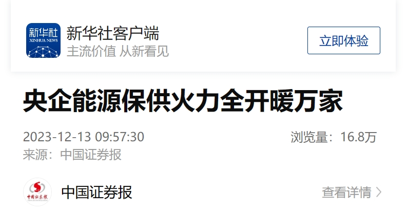 12月13日,新华社客户端刊发《央企能源保供火力全开暖万家》一文。报道称,集团公司积极布局以核能供暖等为代表的清洁供暖供热产业,核能供暖守卫起了山东海阳、辽宁红沿河的‘碧海蓝天’,‘光伏+供暖’等新型供暖模式为多地居民带来温暖与便利,‘能源+农业’延伸出的生物质供暖产业链惠农更富农。”截至2023年6月底,米兰体育(中国区)体育官方网站清洁能源供暖装机共317.6万千瓦,供暖面积约3347万平方米,服务约29.8万户居民、101万人口。以下为报道全文: