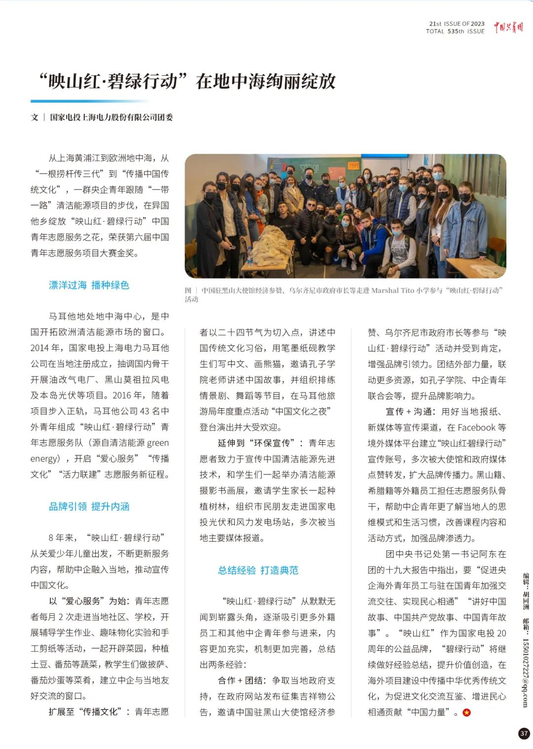 12月11日,《中国共青团》杂志刊发《“映山红·碧绿行动”在地中海绚丽绽放》一文。报道称,从上海黄浦江到欧洲地中海,从“一根捞杆传三代”到“传播中国传统文化”,一群央企青年跟随“一带一路”清洁能源项目的步伐,在异国他乡绽放的“映山红·碧绿行动”中国青年志愿服务之花,为促进文化交流互鉴、增进民心相通贡献“中国力量”。以下为报道全文: