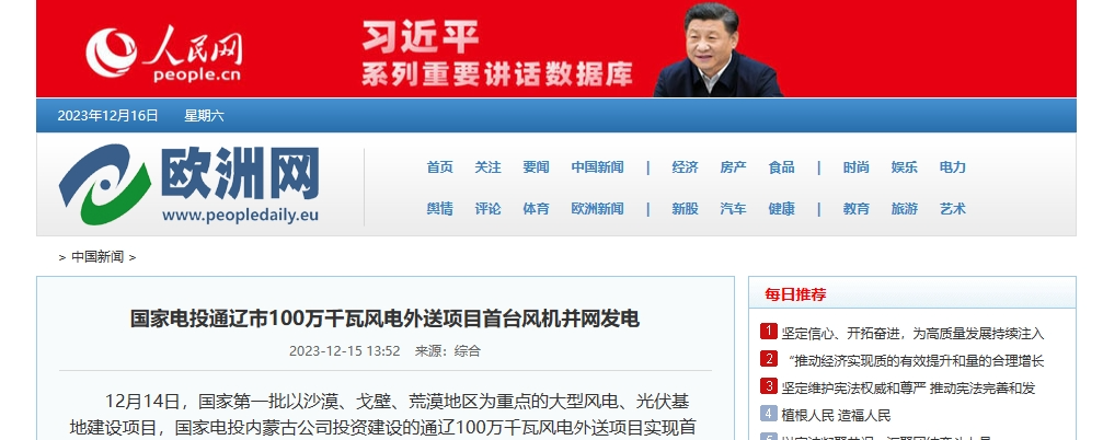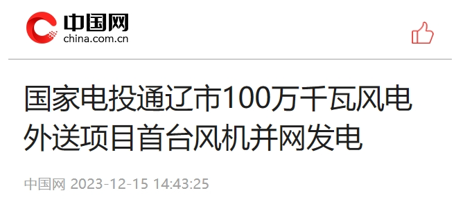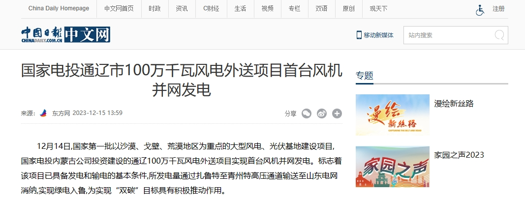 12月15日,人民网、中国日报、中国网等多家媒体报道分别发表《米兰体育(中国区)体育官方网站通辽市100万千瓦风电外送项目首台风机并网发电》一文。报道称,内蒙古公司投资建设的通辽100万千瓦风电外送项目是国家第一批以沙漠、戈壁、荒漠地区为重点的大型风电、光伏基地建设项目,所发电量通过扎鲁特至青州特高压通道输送至山东电网消纳,实现绿电入鲁,为实现“双碳”目标具有积极推动作用。以下为报道全文: