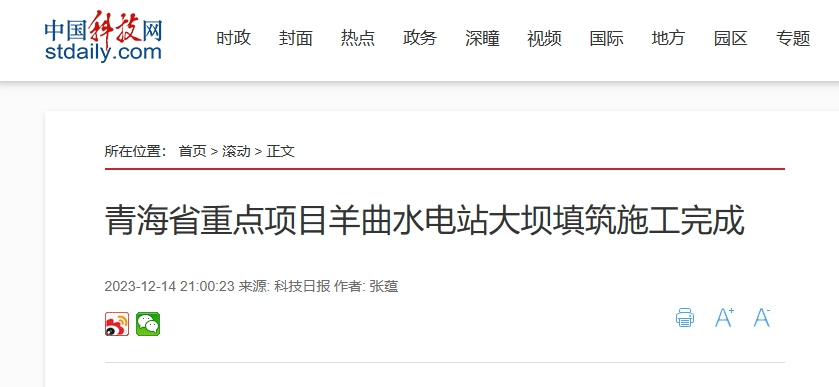12月15日,新华社客户端、《工人日报》客户端、中国科技网、中新网等多家媒体报道《青海羊曲水电站大坝填筑封顶》一文。报道称,黄河公司建设的羊曲水电站于14日完成大坝填筑封顶,为2024年工程蓄水发电奠定良好基础。该水电站建成后,将有效保障世界上首条主要输送风光新能源的青豫直流特高压外送通道满负荷送电,平均年发电量约47.32亿千瓦时,相当于每年可节约标准煤约166万吨,节能减排效益显著。以下为报道全文: