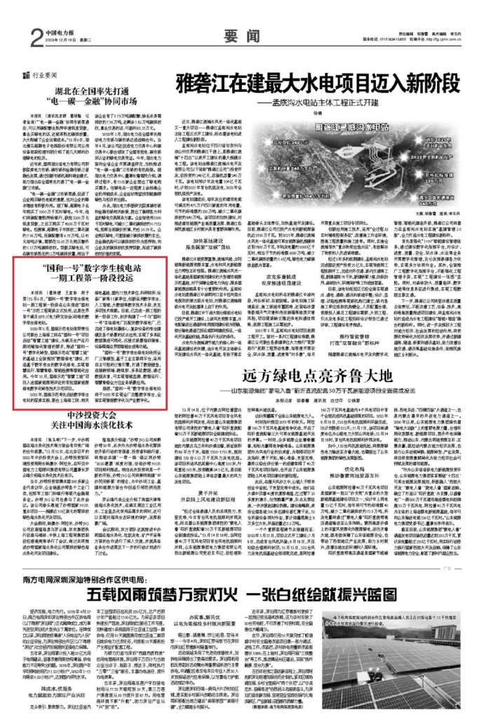 12与19日,《中国电力报》刊发《“国和一号”数字孪生核电站 一期工程第一阶段投运》一文。报道称,“国和一号”数字孪生核电站依托全厂三维模型,基于工业互联网平台,采用自主可控的三维引擎,打通了数据壁垒,连接跨领域、跨组织、多系统数据,通过数据共享,可实现智能监测、数智运行、智慧维修全方位业务场景应用。“国和一号”数字孪生核电站一期工程第一阶段已在山东荣成“国和一号”示范工程现场正式投用,这是世界首个满足EPRI(电力研究协会)标准的数字孪生核电站。以下为报道全文: