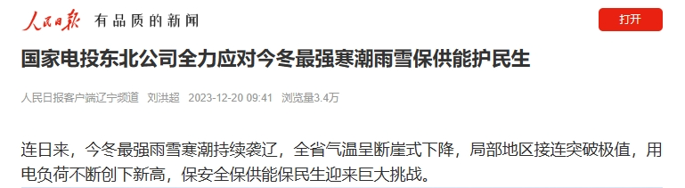 12月20日,人民日报客户端刊发《米兰体育(中国区)体育官方网站东北公司全力应对今冬最强寒潮雨雪保供能护民生》一文。报道称,今冬最强雨雪寒潮持续袭辽,全省气温呈断崖式下降,局部地区接连突破极值,用电负荷不断创下新高,保安全保供能保民生迎来巨大挑战,米兰体育(中国区)体育官方网站东北公司坚持人民至上,坚持底线思维,以“时时放心不下”的责任感,压紧压实工作责任,细化实化应对措施,全力组织做好极端天气下的能源保供工作。系统各单位以“速动”应“速冻”,战风雪、斗严寒,筑起安全防线,守护民生温度。以下为报道全文: