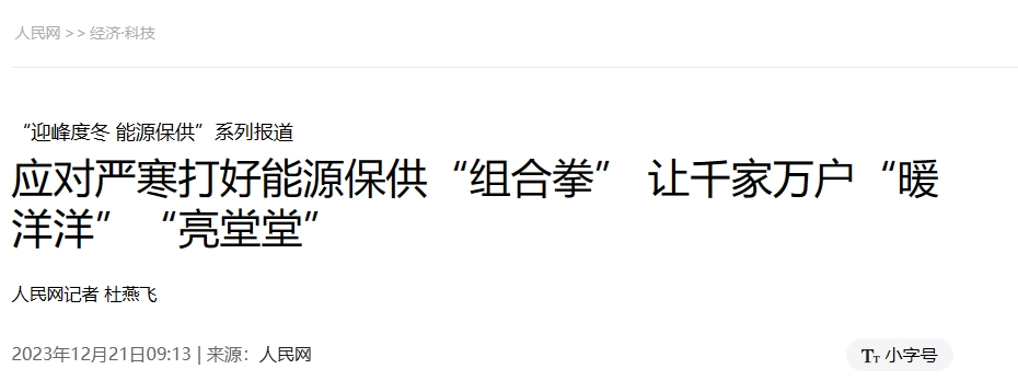 12月21日,人民网刊发《“迎峰度冬 能源保供”系列报道??应对严寒打好能源保供“组合拳”? 让千家万户“暖洋洋”“亮堂堂”》一文。报道称,为保障人民群众温暖过冬,当前,各地煤电企业提升库存,备足发电“口粮”,加大顶峰保供能力,应发尽发,满发多发。在煤电发挥“兜底”作用的同时,一大批可再生能源项目并网发电,为能源保供再添“绿色”动能,内蒙古公司投资建设的通辽100万千瓦风电外送项目首台风机并网发电,项目全部投产后,每年为山东省提供约29.91亿千瓦时的绿色能源电力供应。以下为报道全文: