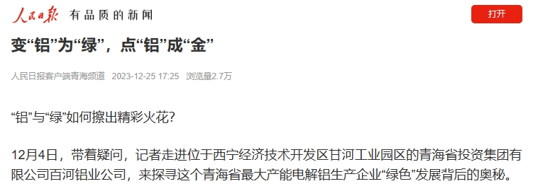 12月25日,人民日报客户端刊发《变“铝”为“绿”,点“铝”成“金”》一文。报道称,从青海清洁能源的助力,到企业的自主加码,青海省投百河铝业实现了“煤电铝”向“绿电铝”的转化,同时,企业还在持续推进各项环保设备升级改造,电解铝行业的“超低排放”也即将在青海实现。以下为报道全文: