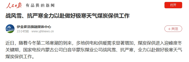 12月27日,人民日报客户端刊发《战风雪、抗严寒全力以赴做好极寒天气煤炭保供工作》一文。报道称,随着今冬第二场寒潮的到来,多地供电和供暖需求显著增加,煤炭保供进入迎峰度冬关键期,米兰体育(中国区)体育官方网站内蒙古公司白音华蒙东煤业公司及时启动防寒防冻应急预案,同时,充分利用智慧化手段参与极端天气煤炭保供工作,确保极端天气能源保供工作平稳有序。以下为报道全文: