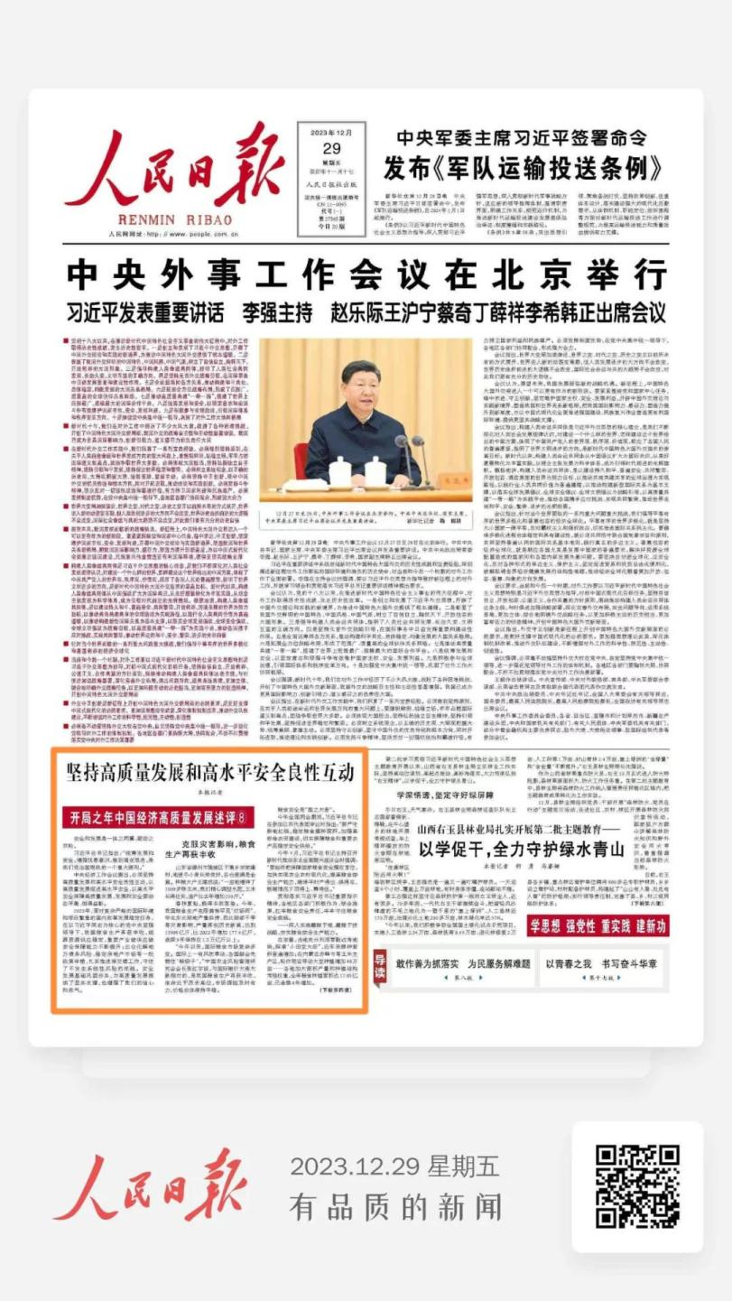 2023年,面对复杂严峻的国际环境和艰巨繁重的国内改革发展稳定任务,在以习近平同志为核心的党中央坚强领导下,我国粮食生产再获丰收,能源资源供应稳定,重要产业链供应链安全保障能力不断提升;出台化解地方债务风险、稳定房地产市场等一批政策举措,扎实推进保交楼工作,守住了不发生系统性风险的底线。安全发展基础巩固夯实,为高质量发展提供了坚实支撑,也增强了我们的信心和底气。