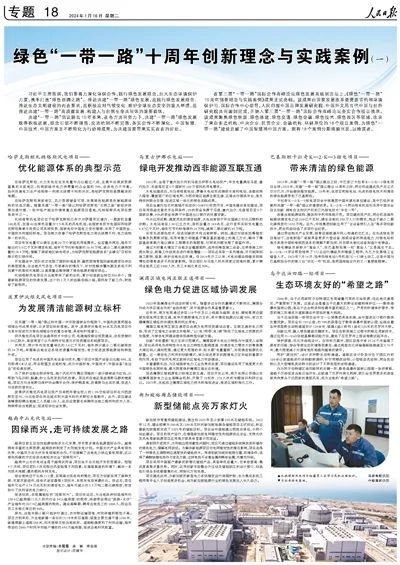 在第三届“一带一路”国际合作高峰论坛绿色发展高级别论坛上,《绿色“一带一路”10周年创新理念与实践案例》成果正式亮相。该成果由国家发展改革委资源节约和环境保护司、国际合作中心指导,人民日报中国品牌发展研究院、中国外文局当代中国与世界研究院共同编制完成,并纳入第三届“一带一路”国际合作高峰论坛务实合作项目清单。该成果聚焦绿色能源、绿色基建、绿色交通、绿色金融、绿色技术、绿色园区等领域,收录了来自多边机构、中央企业、民营企业、金融机构、科研单位的18个项目案例,为绿色“一带一路”建设贡献了中国智慧和中国方案。现将18个案例分期摘编刊发,以飨读者。