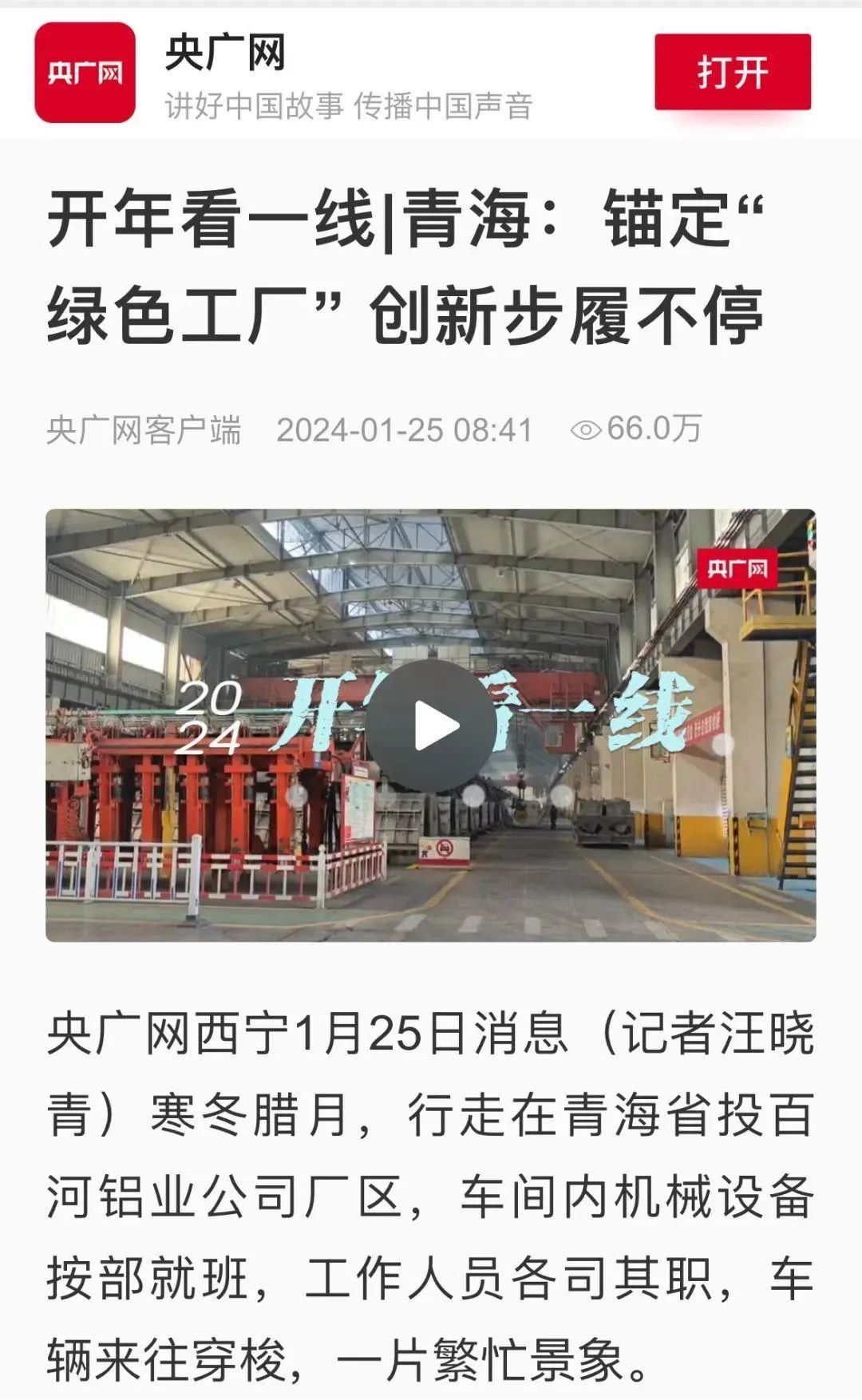 1月25日,央广网客户端刊发《开年看一线|青海:锚定“绿色工厂”创新步履不停》一文。报道称,青海省投坚决贯彻新发展理念,加快产业绿色转型,积极探索低碳发展模式,倾力打造绿色生态工厂。截止2023年,青海省投百河铝业公司2023年累计光伏并网发电2236万千瓦时,节约吨铝单耗33度电,累计产量68.69万吨,营业收入115.1亿元,为青海省经济建设做出了积极贡献。以下为报道全文: