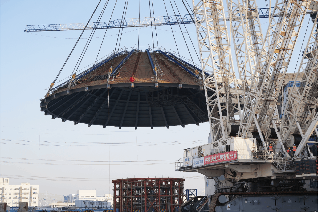 本次吊装的钢穹顶模块是屏蔽厂房重要组成部分,上方承载非能动安全壳冷却水储存箱,可为反应堆厂房提供抗海啸、抗飞机撞击等保护作用,是保障反应堆厂房及其内部结构完整性、密封性的重要结构。钢穹顶整体呈圆锥形,由32根径向主梁、3道圈梁、96个钢覆面板及底部连接的3个钢平台组成,直径约41米,高约11米,吊装总重量接近1000吨,经过起钩、悬停、旋转、带载行走、下落、调整等系列动作,历时2小时12分顺利就位。