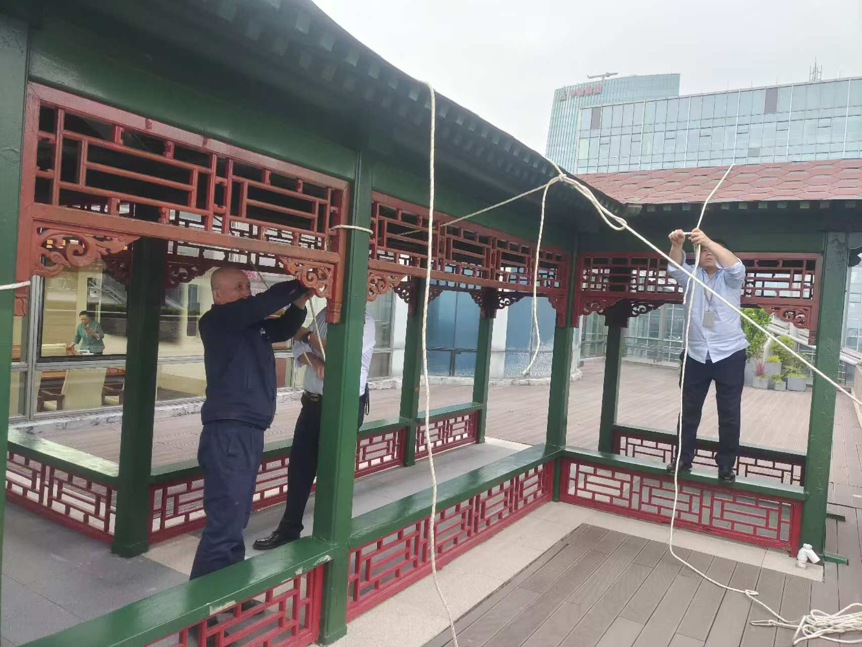 北京市发布大风橙色预警后,中电置业立即行动起来,加大项目现场安全隐患排查力度,确保人员和财产安全。提前将中国电力本部大楼空中花园绿植、桌椅安置于安全区域,临时加固亭台等设施,全面排查玻璃幕墙、户外设备,筑牢大风天气安全防线。