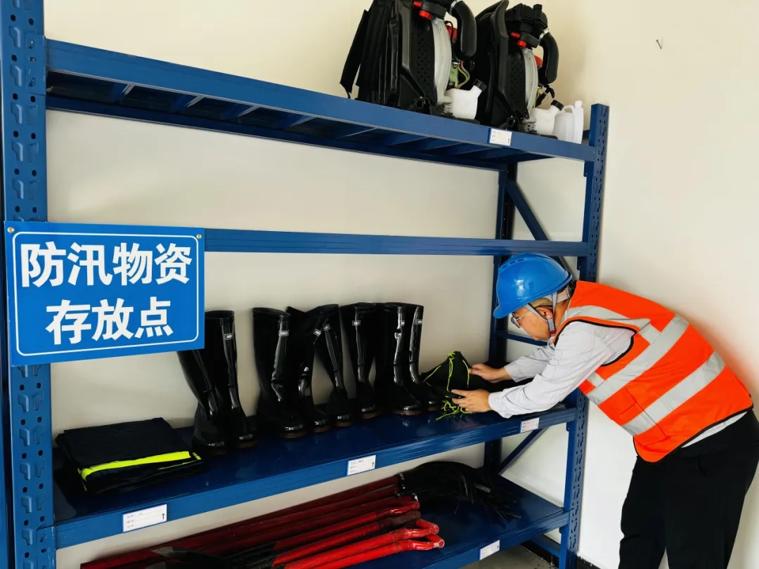 河北公司保定曲阳恒阳光伏电站员工盘点库房防汛物资。