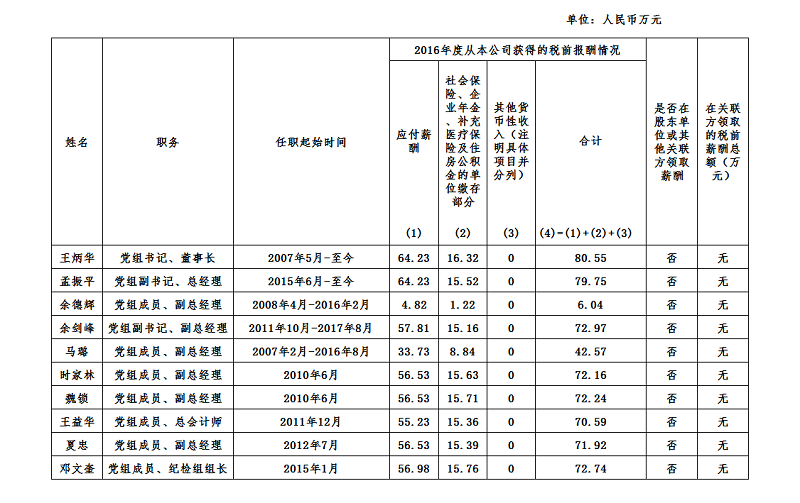 国家电力投资集团公司企业负责人2016年度薪酬情况