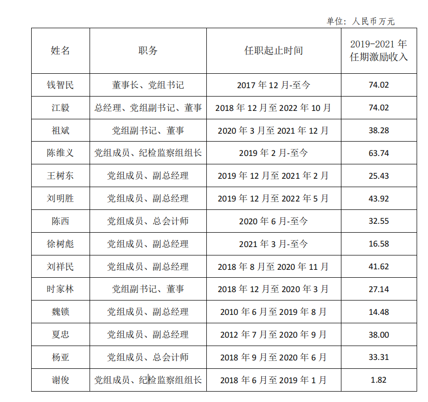 国家电力投资集团公司企业负责人2019-2021年任期薪酬情况