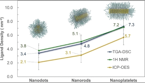 研究人员发现,与其他形状(如可能具有错列排列的纳米点和纳米棒)相比,被称为纳米片的更扁平、更均匀的粒子能够使更多配体紧密附着。