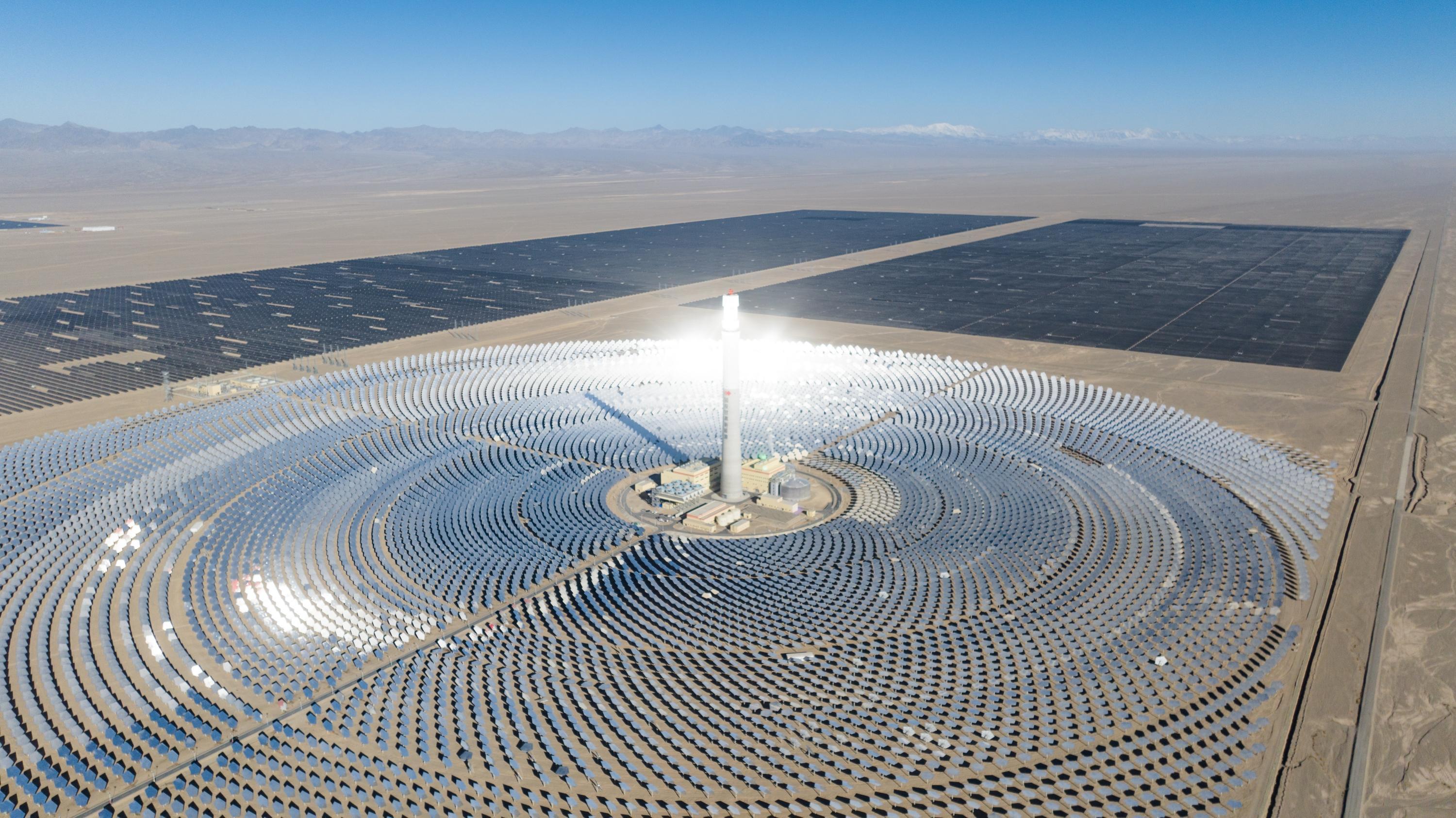 此次并网发电的光热区占地面积约3.2平方公里,采用塔式聚光发电技术,以熔盐作为热储能介质。