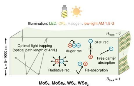 “过渡金属二硫化物是层状材料,如WSe2和MoS2,它们具有高光吸收率、良好的带隙,即使存在一些缺陷,也正在迅速成为此类应用的‘足够好’材料,”合著者Eric Pop补充道。“我们使用一个现实的详细平衡模型,测量光学特性和几种复合机制,包括缺陷,来研究它们的基本性能极限。在大多数情况下,即使使用当今可用的材料,最大化太阳能电池性能的TMD厚度也只有20到30纳米。”