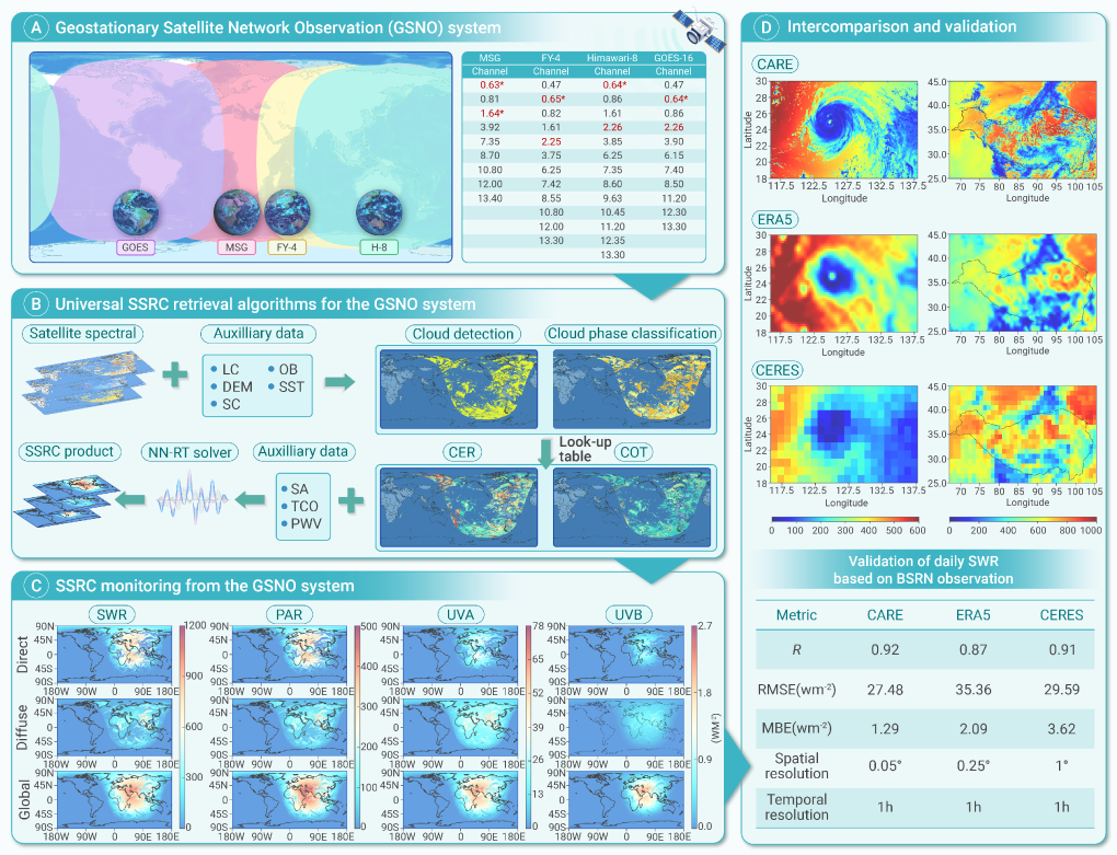 “卫星遥感技术具有数据连续性强、覆盖范围广等特点,是监测地表太阳辐射变化的最有效手段之一。”胡斯勒图说,团队在2023年已成功研发了地表太阳辐射近实时遥感监测系统,此项研究中,团队在此前基础上整合了国内外多颗新一代地球静止卫星,通过多星组网,实现了近全球尺度的高时空分辨率监测,且探测精度进一步提升。