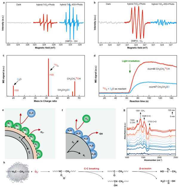 针对上述挑战,中国科学院金属研究所刘岗研究团队发展了“漂浮策略”和“维度定制”相结合的策略,通过在二维TiO2表面形成纳米级碳氮疏水层,赋予了材料可漂浮于中性水溶液表面的特性。该材料具有传统TiO2所不具备的两个功能,一是可漂浮TiO2材料形成了光催化材料、塑料、水和空气的四相界面,将原本微米级的相界面压缩至近零距离的分子级接触;二是不同于传统的光催化重整材料体系主要是利用由光生空穴氧化水分子产生羟基自由基物种,可漂浮TiO2材料主要是利用光生电子还原氧气产生超氧自由基作为氧化物种,其寿命长达1毫秒,传递距离是传统体系中羟基自由基的万倍量级。