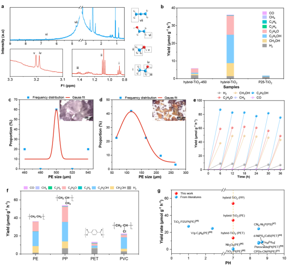 该可漂浮TiO2材料具有优异的光重整塑料性能,在不依赖于腐蚀性溶液预处理的情况下,可将典型塑料(包括聚乙烯、聚丙烯和聚氯乙烯)的光重整效率提升1到2个数量级,同时产生选择性超过40%的高值乙醇产物。