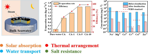 研究人员通过简单的沉积法制备了壳聚糖气凝胶-碳纳米管(CA-CNT)双层结构的太阳能界面蒸发器。亲水性CA基材具有低导热性和垂直排列的孔道结构,有利于提升蒸发器的蒸发效率、水传输能力和耐盐性。上层CNT显示出95.04%的出色太阳光吸收率。在一个太阳能强度下(1kw·m-2),蒸发器的蒸发速率为1.55kg·m-2·h-1。在室外自然光条件下测试其实际适用性,淡水产量为7.15kg·m-2·d-1,可以满足三个成年人一天的需水量。此外,该蒸发器还表现出良好的重金属和染料污水净化能力。这项工作为从海水和污水中获取淡水提供了一种简单的策略。