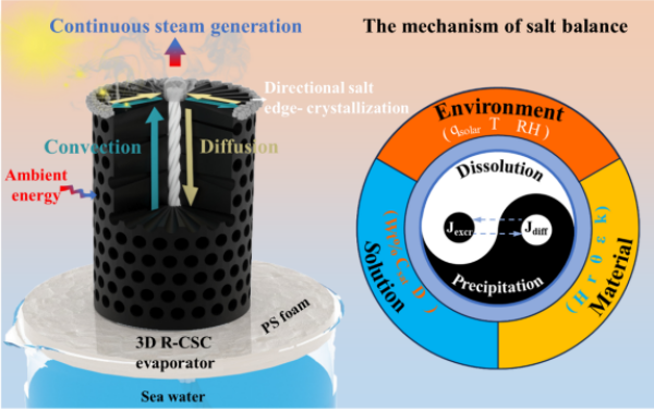 该蒸发器独特的水传输路径可以增强其顶部盐溶液的径向传输并使盐分在顶部边缘定向沉积,从而实现零液体排放和盐分的收集。通过实验和热力学计算证明,增加蒸发器的高度可以有效提高蒸发性能。对于直径为1.7cm的R-CSC蒸发器,当蒸发器高度增加到3cm时,太阳能蒸发速率高达2.93kg·m-2·h-1,太阳能蒸发效率为97.86%。