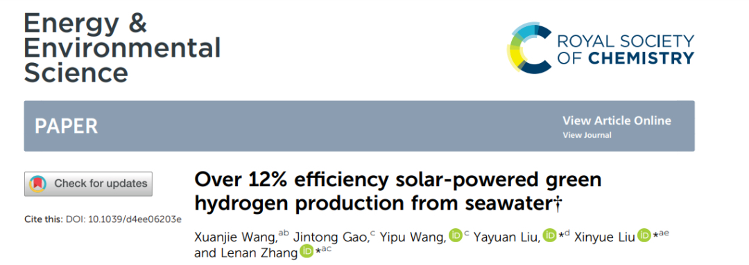 日前,相关论文以《从海水中生产太阳能绿色泡沫的效率超过12%》(Over 12%efficiency Solar-powered green Hydro production from seawater)为题在 Energy & Environmental Science [1]中发表。理海大学助理教授王炫杰为第一作者,康奈尔大学助理教授张乐楠、多伦多州立大学助理教授刘心悦和霍普金斯大学助理教授刘亚媛担任共同通讯作者。