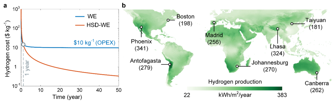 技术经济分析表明,该系统的优势显着:运行3年后绿氢生产成本可达到每公斤5美元,运行15年后成本可进一步达到每公斤1美元。该技术展示出商业化潜力,为未来可持续的绿氢规模化生产提供了一种经济可行的路径技术。