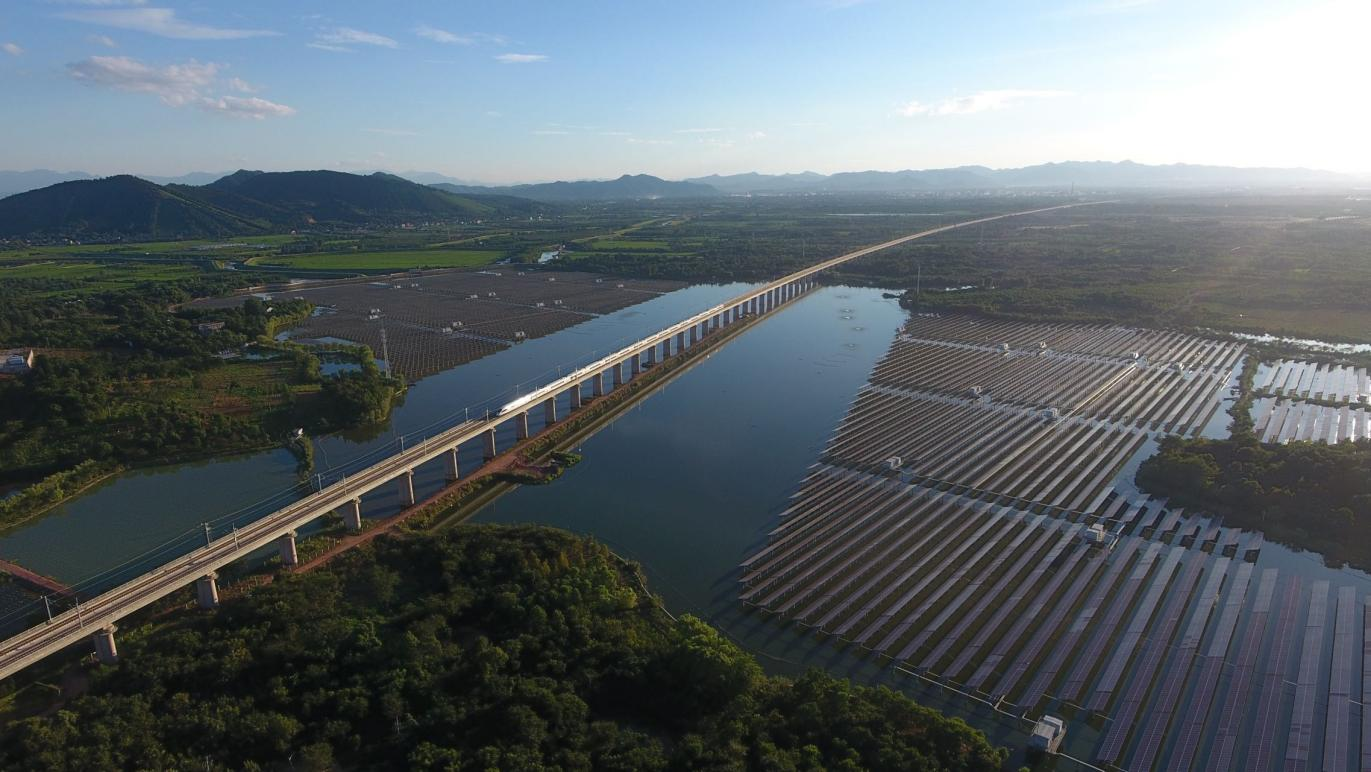 公司50MWP“渔光互补”电站坐落于安吉县梅溪镇草荡水库,商合杭(商丘-杭州)高铁线穿湖而过。电站装机容量43.72MWp,可研年利用小时965小时,年发电4138万KWh,是集水产养殖、可研示范、生态休闲、旅游观光于一体的特色渔业产业园,是清洁能源生产示范基地。该项目将渔业养殖和光伏发电结合在一起,通过在水面上发电,水面下养殖,工程设计上更多的考虑了日常养殖的需求,更好地为渔民提供便利,最大化“渔光互补”的经济效益,达到养殖和发电并行的模式,实现了一地两用,极大的提高了土地的利用效率,提高了单位面积土地的产值,做到光伏发电与渔业养殖的完美结合,有效提升了项目综合效益,新能源发电、水产养殖和环境保护实现了同步发展,千亩鱼塘、绿水青山、光伏电站与高铁线共同构成一幅美丽和谐的生态画卷。