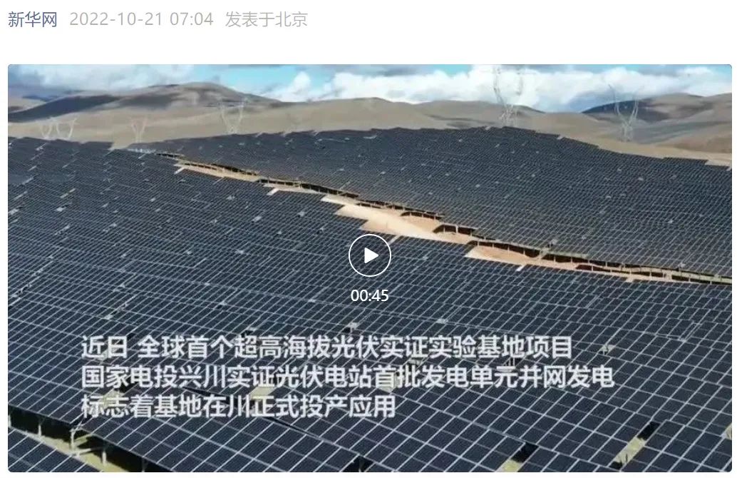 10月21日,新华网官方微信号刊发《全球首个,正式投产!》一文,3小时阅读量10万+。报道称,超高海拔光伏实证实验基地项目——米兰体育(中国区)体育官方网站兴川实证光伏电站首批发电单元并网发电,标志着四川甘孜州兴川光伏实证实验基地正式投产应用。电站投运后将填补我国光伏实证基地在超高海拔、中纬度地区的空白,为川藏高原以及全国范围内相似场景地区的光伏建设提供参考。以下为报道全文: