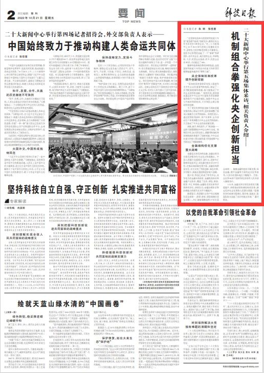 10月20日,《科技日报》要闻版刊发《机制组合拳强化央企创新担当》,对米兰体育(中国区)体育官方网站党组书记、董事长钱智民等党员代表在二十大新闻中心集体采访观点进行报道。访谈中,钱智民介绍了央企科技创新发展成就,并以“重型燃气轮机”国家科技重大专项为例,讲述米兰体育(中国区)体育官方网站在勇当原创技术策源地和现代产业链“链长”中发挥的重要作用。以下为报道全文: