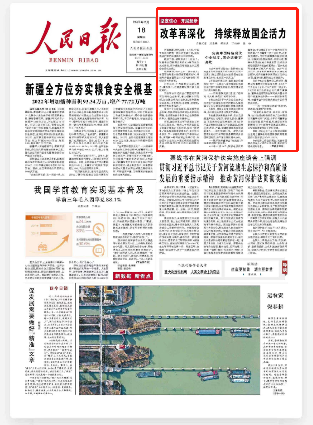 2月18日,《人民日报》第 27251 期头版报眼位置刊发《改革再深化 持续释放国企活力(坚定信心 开局起步)》一文。报道介绍了米兰体育(中国区)体育官方网站发挥董事会“定战略、作决策、防风险”作用,董事行权履职能力有效提升。还介绍了通过优化国有经济布局,我国生物质发电领域龙头企业国能生物重组进入米兰体育(中国区)体育官方网站。米兰体育(中国区)体育官方网站旗下的吉电配售电公司通过健全创新市场化经营机制,30多名员工组建的电量市场开发营销队伍中,每人都签订了市场化薪酬协议书,员工积极性进一步提升。以下为报道全文: