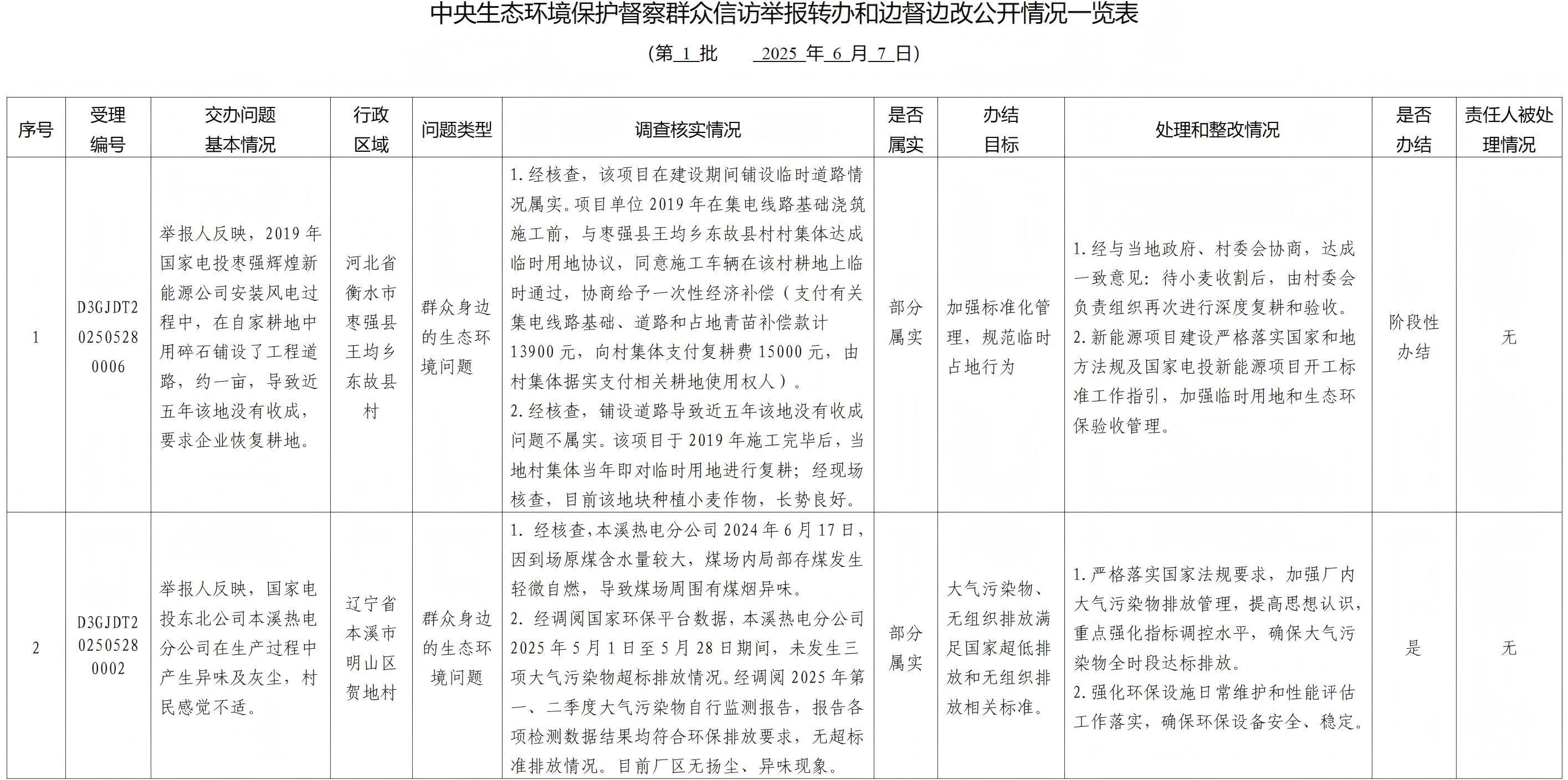 中央生态环境保护督察群众信访举报转办和边督边改公开情况一览表(第一批)