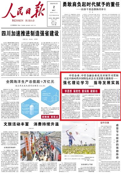 《人民日报》头版:中管企业、中管金融企业扎实开展学习贯彻习近平新时代中国特色社会主义思想主题教育——强化理论学习 指导发展实践(学思想 强党性 重实践 建新功)