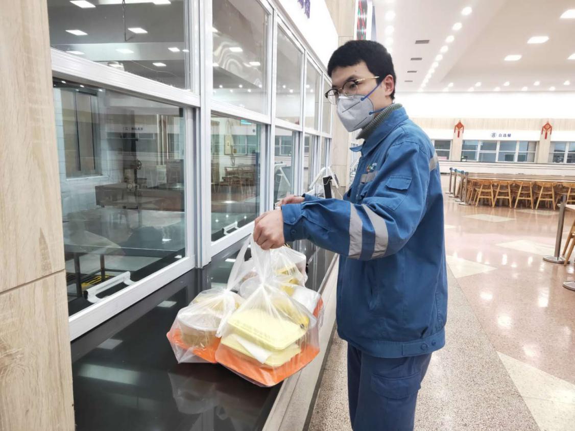 一日三餐,王作宇总是雷打不动地出现在食堂,只见他仔细地清点着AB套餐份数,然后三下五除二,熟练地打包好酸奶、水果,两手拎得满满当当,一阵风似的往外跑,装进送餐小车,俨然一副外卖小哥的专业模样。